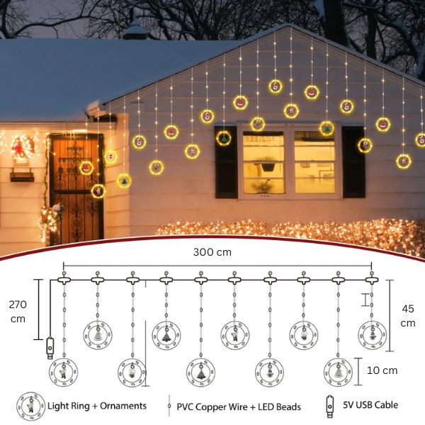 Delikatna svjetlucava svjetla, pažljivo smještena unutar prozirnih prstenova, stvaraju očaravajuću atmosferu dok bacaju blistavi sjaj na viseće figurice.